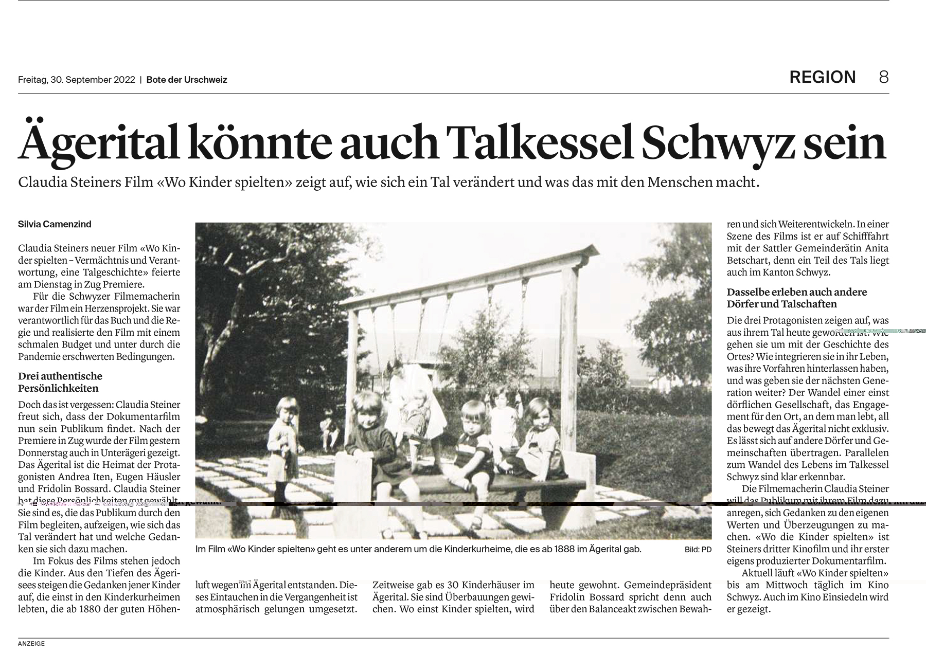 Artikel über Filmstart in der Zeitung "Bote der Urschweiz";